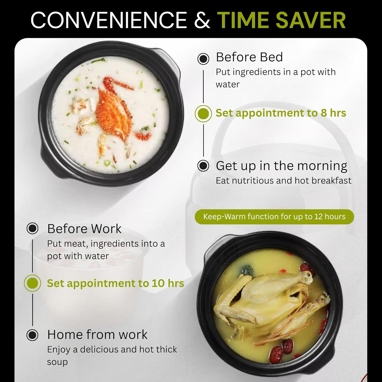 Keep Warm & Timer: Keeps food warm up to 12 hours and allows meal scheduling.