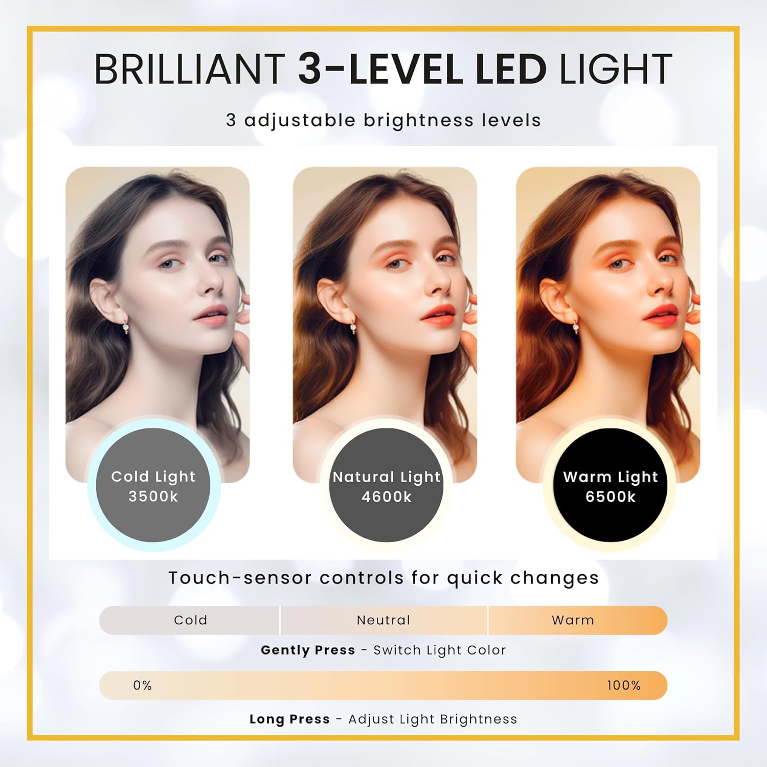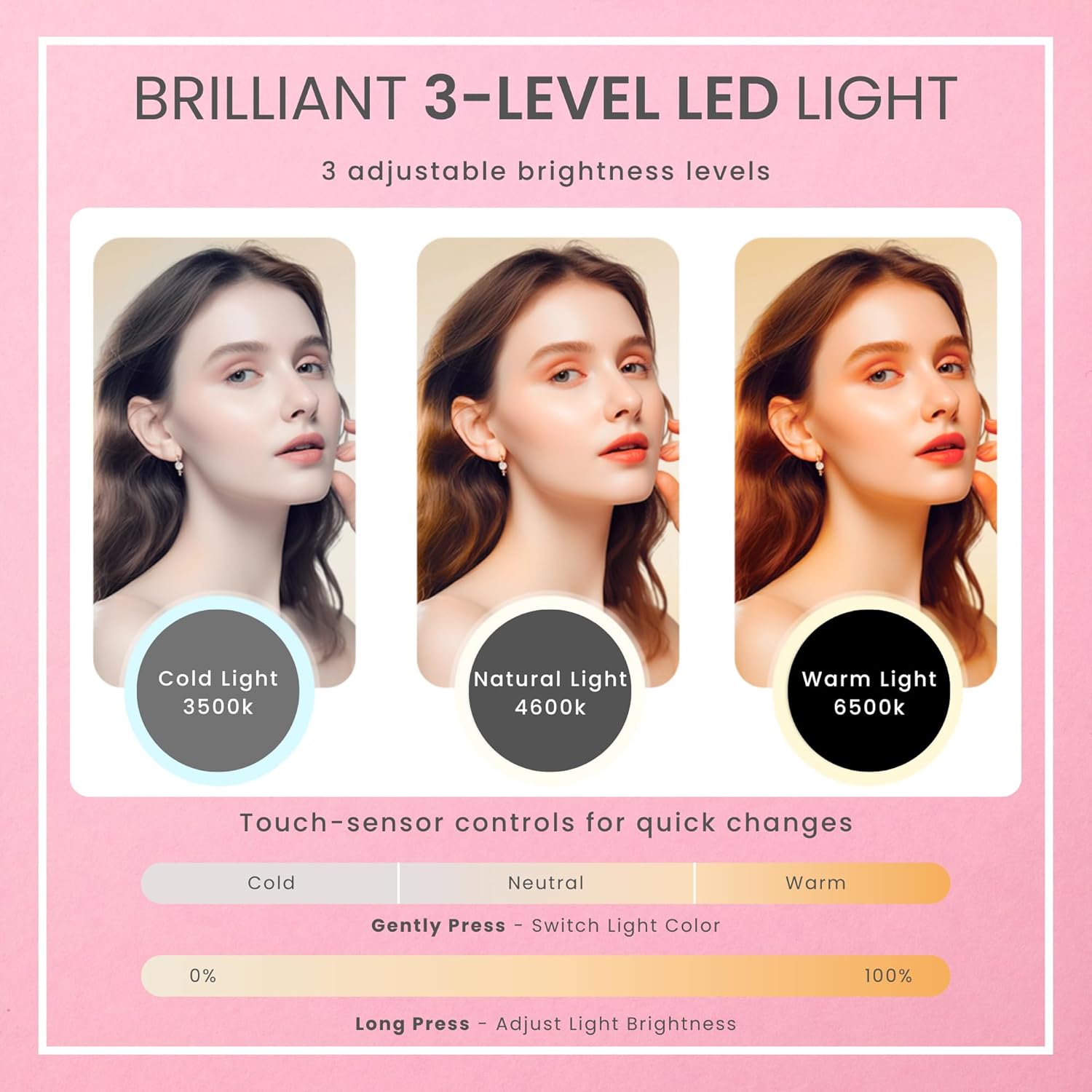 Includes a detachable LED mirror with three lighting modes (Cold, Natural, Warm) and adjustable brightness (3500K–6500K) for flawless makeup application anytime, anywhere.